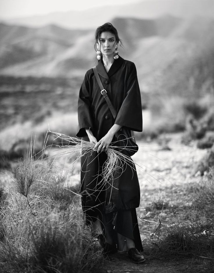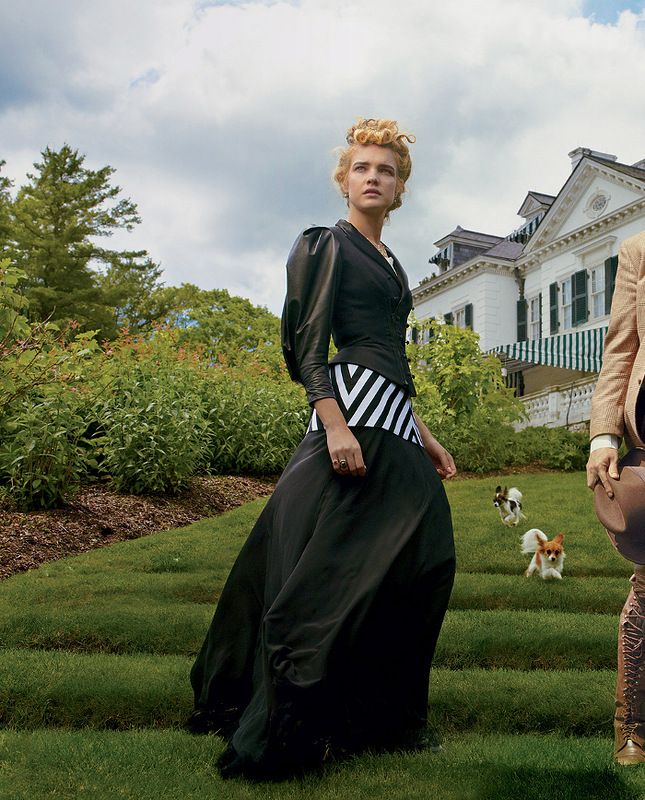 Гальяно, хорошо известный в 2000-х годах своим громким и театральным образом, сидит в ванне в богато украшенной ванной комнате, и зрителю видны только его профиль и руки, что раскрывает о нем столько, сколько может любой студийный портрет. Водянова стоит на вершине Пале Гарнье, или Парижской оперы, в то время как ветер продувает ее шелковое платье Donna Karan, торжествующе позируя перед большим 19Скульптура Пегаса X века.