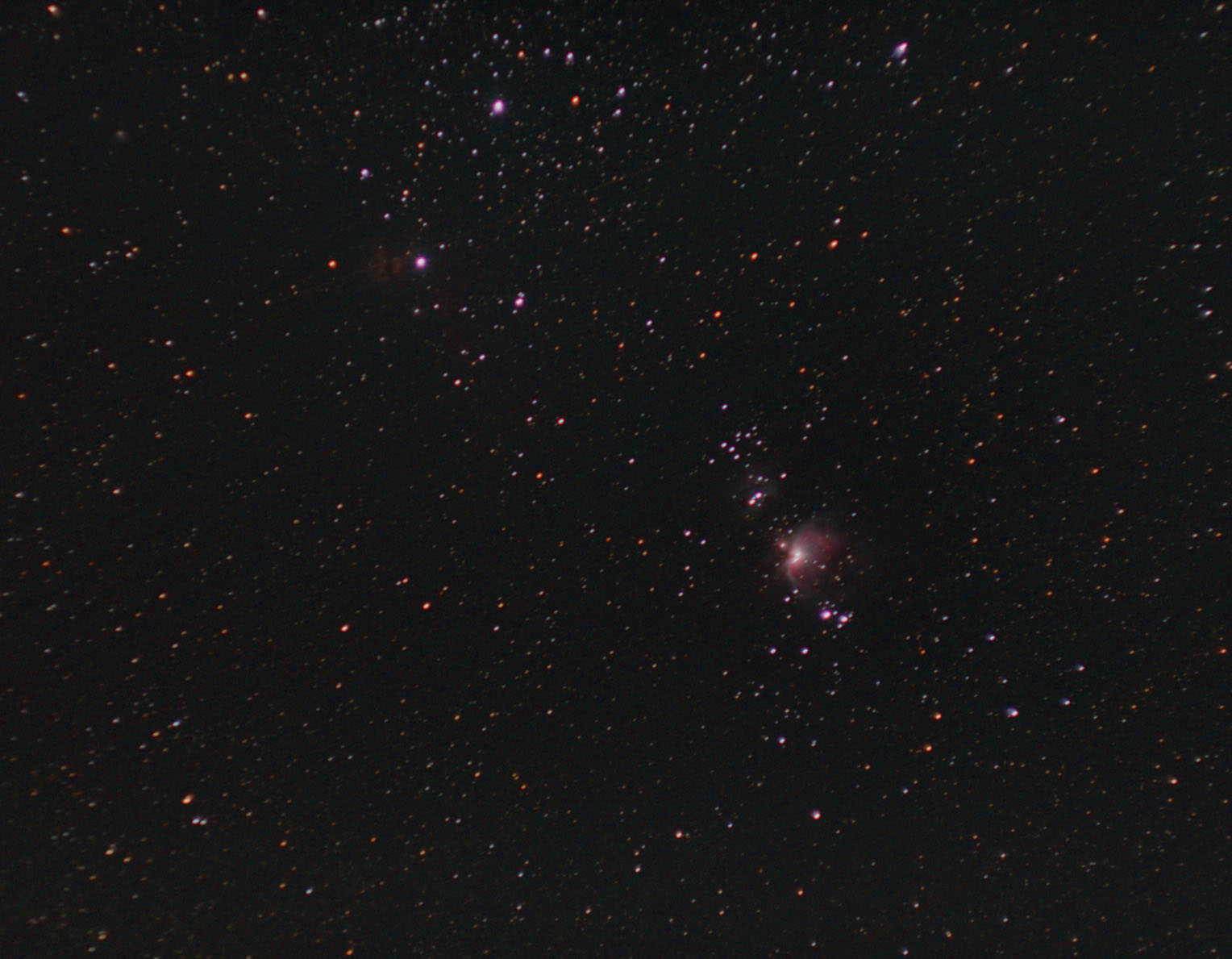 И потратил я её на М42, самый притягательный для любителей астрономии зимний объект северного неба, светящаяся эмиссионная туманность, это самая яркая и попсовая, так сказать, диффузная туманность, блеск около 4 звездной величины, легко видна невооружённым глазом, находится на расстоянии около 1344 световых лет от Земли и имеет 33 световых года в поперечнике. Так же в кадр попала M 43, Туманность де Мерана, где происходят процессы активного звездообразования. Далее левее виднеется отражательная туманность “Бегущий человек”!! Всматриваясь, тоже разглядел бегуна). Так же в кадре скопление угольный вагон NGC1981 и NGC 1980, потерянный драгоценный камень Ориона.
