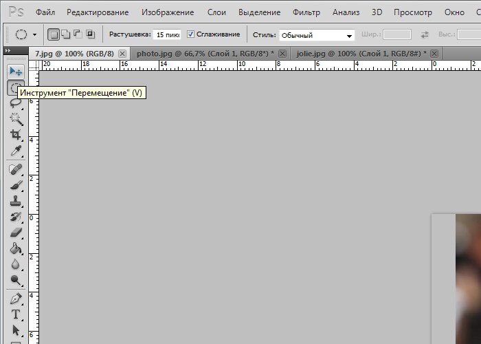 Далее берем инструмент «Перемещение» и перетягиваем выделение на вкладку со второй открытой фотографией.