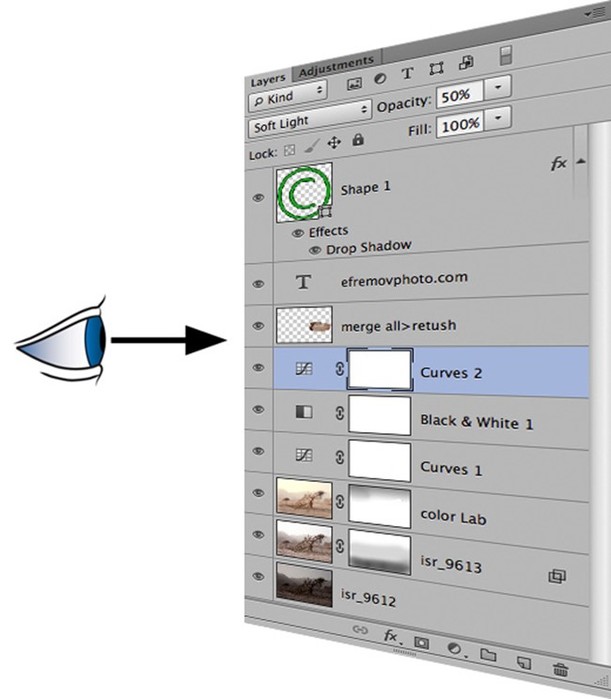 Выключаем видимость для подлежащего слоя, тем самым открывая оригинал.