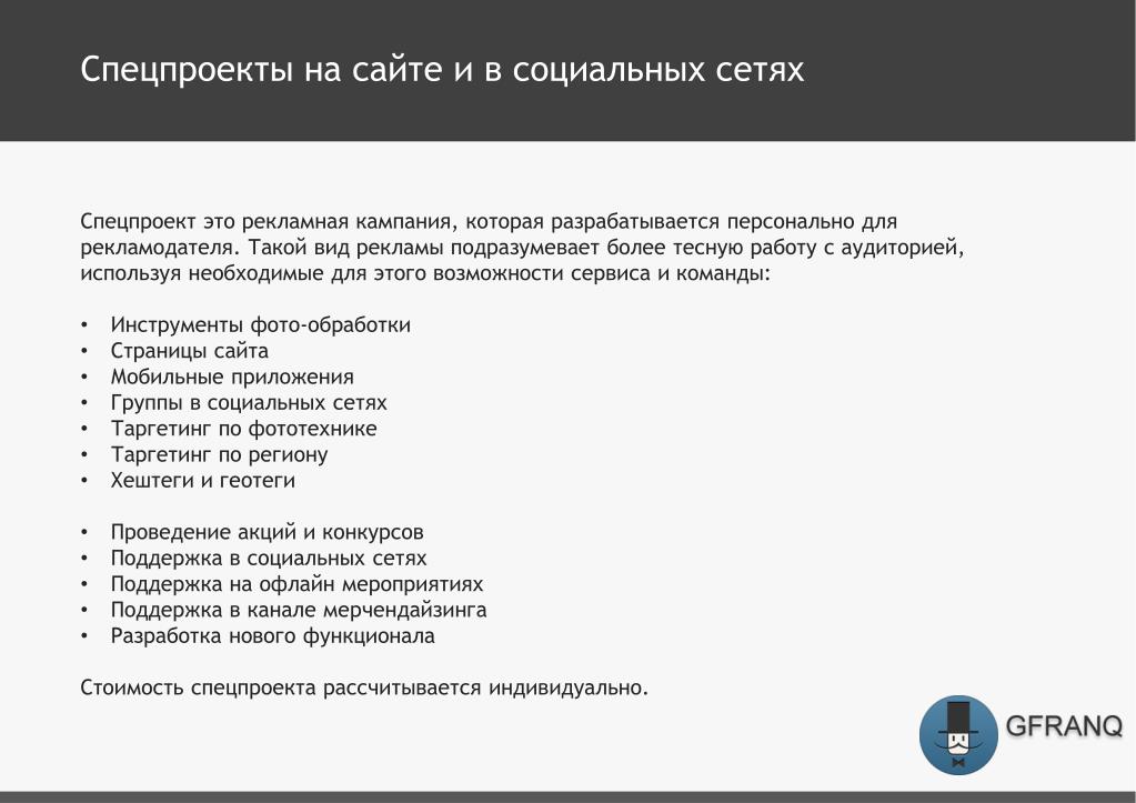 Кроме возможности глубокого взаимодействия с целевой аудиторией, они не требуют больших затрат на продвижение бренда. Предполагается использование таких сетей как: Instagram, ok.ru, vk.com, facebook.com, а также сервиса Youtube, на котором можно размещать так называемое backstage-видео, то есть видео со съемок с освещением самого их процесса. Согласно рекомендациям специалистов в сфере SMM (маркетинга в социальных сетях), структура контента выглядит следующим образом: Прямая реклама – 20% Развлекательный контент – 25% Вовлекающий контент – 20% Образовательный контент (включая нативную рекламу) – 35%