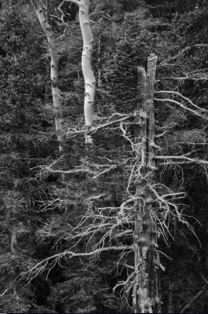Давайте проанализируем фотографию выше. Наши глаза устроены так, что обращают внимание в первую очередь на яркие объекты или острые предметы. В этом случае сломанная мертвая сосна справа и две осины слева, самые яркие объекты снимка, привлекают наш взгляд. Эти формы создают параллельные линии, которые стимулируют наш взгляд двигаться вверх и вниз по каждому стволу. Горизонтальные ветви сосны помогают движению взгляда вправо и влево.