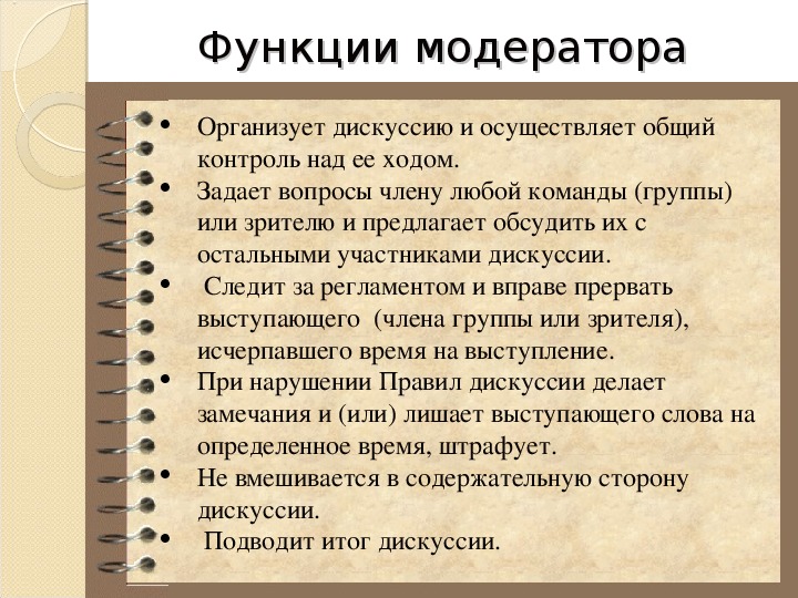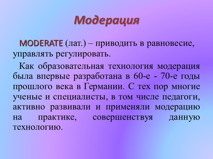 Само слово «модерация» происходит от латинского «модерор», что означает «контролировать, сдерживать». Такая работа важна, как правило, на публичных: