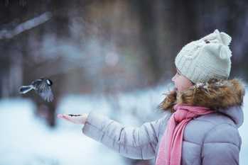 Еще одна идея для детских фото – фотографирование с пернатыми. Насыпьте в кормушку зернышки, и на вашу фотосессию отовсюду слетятся шустрые синички. Снегири и свиристели нередко целыми стайками сидят на деревьях и кустах, угостите и их тоже – своим присутствием они добавят красок на фотографиях.