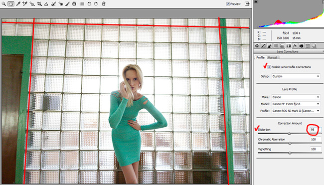 Чем дальше прямые линии на изображении расположены от центра, тем сильнее они изогнуты. Поэтому для контроля исправления дисторсии следует выбирать наиболее длинные прямые линии, проходящие с краю кадра.