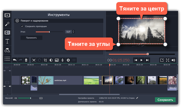 Наведите курсор на любой угол; после того как курсор станет белым, щелкните мышью и переместите угол.