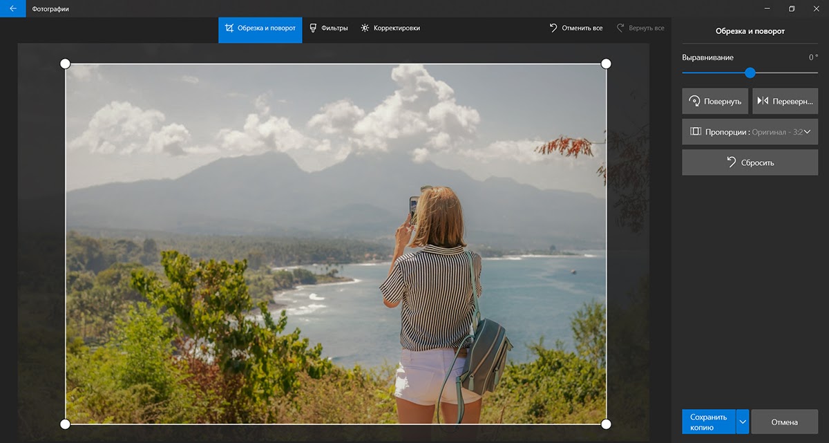 Обрезка изображения путем перетаскивания любого дескриптора обрезки внутрь.
