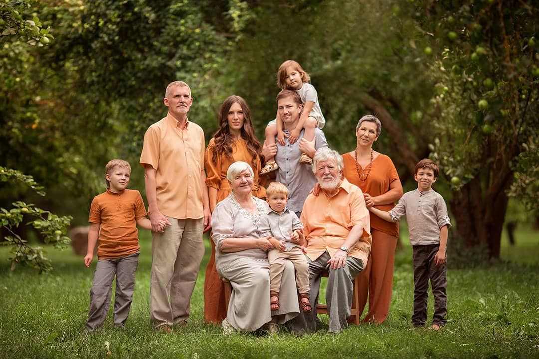 Для простой и классической большой семейной фотографии попросите всех одеться в однотонных нейтральных тонах. Однако вам не обязательно придерживаться серо-коричневого цвета. Попробуйте использовать нежно-сиреневые и серо-лиловые тона и не забудьте изменить цвет брюк и юбок каждого. Эта нежная цветовая гамма идеально подходит для семейных фотографий из нескольких поколений.