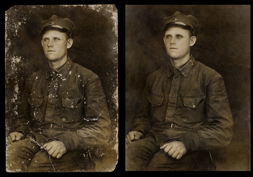 Сначала копирую (по фотографии или скану). Я создаю дубликат вашего оригинала и исправляю повреждения или добавляю новые улучшения в новую копию для вас в Adobe Photoshop (в цифровом виде на компьютере). Иногда меня просят отремонтировать более старый оригинал — я бы порекомендовал вам обратиться в службу реставрации музейного качества, которая занимается деликатной специализированной архивной работой, поскольку я не работаю с вашим драгоценным оригиналом.