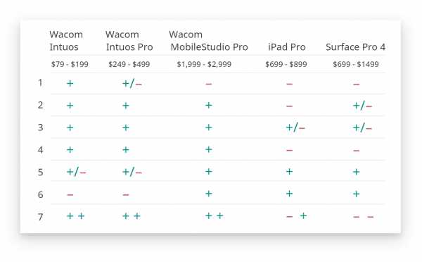 Я включил планшетные компьютеры iPad Pro и Surface Pro 4 в сравнение, потому что некоторым людям интересно насколько они сравнимы с Wacom.
