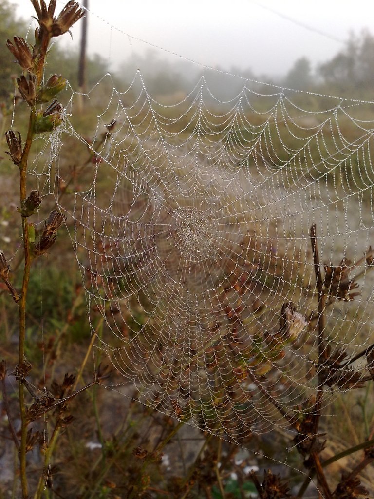 Когда утренний туман рассеялся, я заметил паутину, усеянную каплями росы, когда впервые выглянуло солнце, а утро почти закончилось.