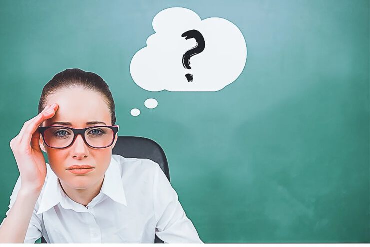 Учитель нарисовал мелом на доске знак вопроса, скопировав место на зеленом фоне. учительница с грустным лицом у школьной доски.