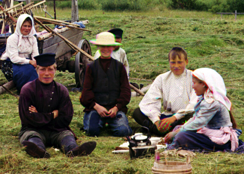Сергей Прокудин-Горский, Ужин во время сенокоса. [Российская Империя] , 1909 г., цифровая цветная композиция Блеза Агуэра-и-Аркаса, 2004 г. — Источник.