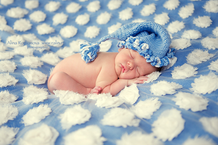 Не нужно зацикливаться на постановочных кадрах. Кормление грудью, первая игрушка, первое платье и прогулки — вот что точно хорошо приживётся в вашем альбоме. Совсем не обязательно делать фотографии с новорождёнными «а-ля натюрморт». Иногда сюжет находится совершенно спонтанно. Например, на фото с голубым пледом малыш просто спит, и даже не пришлось прибегать ни к каким специальным ухищрениям.