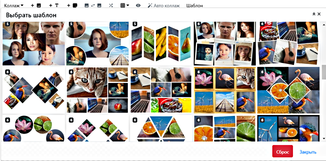 Если коллаж не понравился, можно попробовать создать другой, используя случайные настройки. Для этого есть функция “Случайная заготовка”. К получившемуся изображению можно добавить рамку, надпись или изменить цвет фоновый цвет.