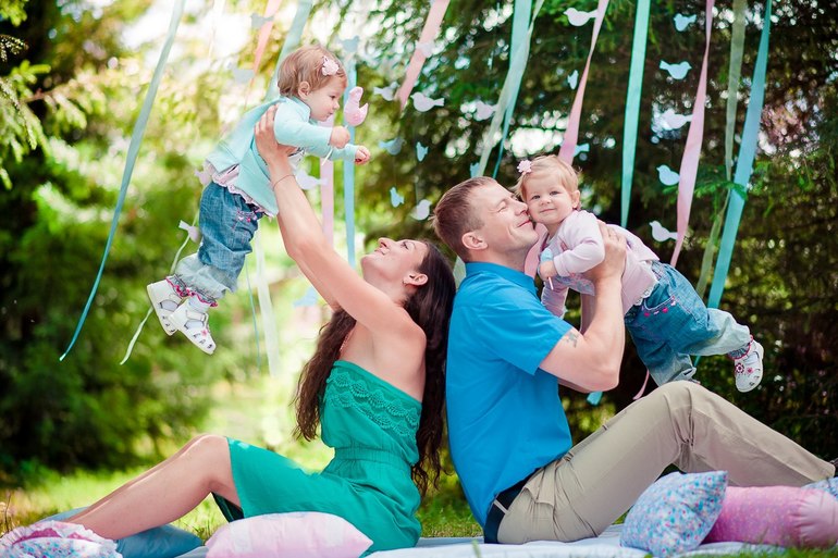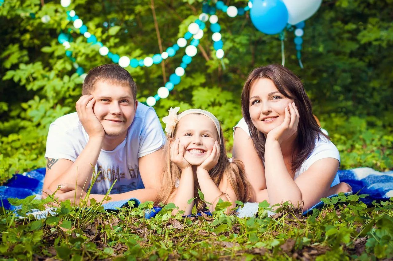 Совместные семейные фотографии всегда очень трогательны и наполнены самыми настоящими чувствами. Ведь для ребенка самое главное, чтобы оба родителя были вместе. А если всем вместе улечься на траву, обняв ребенка, расположившегося по центру, то таким портретом можно будет украсить стену в доме.