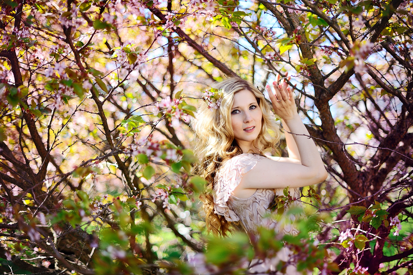 Фотосессии на улице весной в платье можно провести на цветущих деревьях.