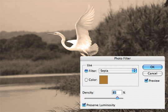 Хотя в основном используется для нейтрализации цветовых оттенков в изображениях, слой настройки фильтра фото может быстро создавать оттенок сепии из черно-белого изображения.