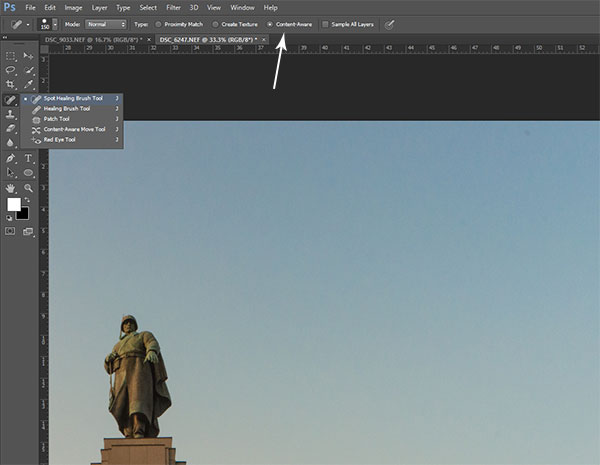 Но даже с этой новой возможностью работы с учетом содержимого, «Точечная Лечащая Кисть» (Spot Healing Brush) все также остается лучшей и более соответствующей для меньших областей, на которые мы легко можем кликнуть и закрасить.