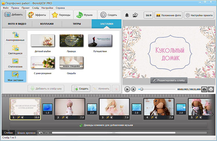 При работе над слайд-шоу с нуля тоже есть свои плюсы, ведь «ФотоШОУ PRO» позволяет продумывать композицию всех слайдов от начала до конца. При надобности в проекте можно также использовать заготовки слайдов из вкладок «Коллажи», «Заставки» и «Титры».