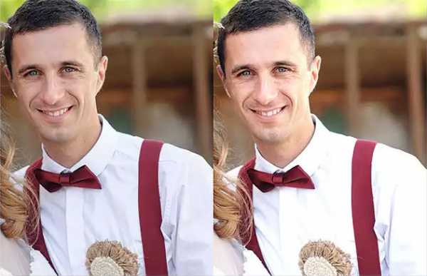 Правое фото нормальное, а левое — недоэкспонировано. Большая часть деталей в волосах мужчины потеряна. Следовательно, гистограмма покажет высокий пик с левого края.