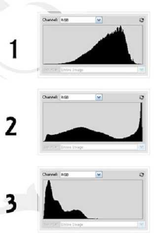 На рисунке три разные гистограммы. В первом примере ни одна из деталей снимка не теряется, нет лишних теней или засветки. Наиболее высокие значения находятся близко к центру графика, кривая красиво понижается к краям – наподобие колокола. График отображает снимок с большим количеством ярких фрагментов из среднего тонового диапазона.