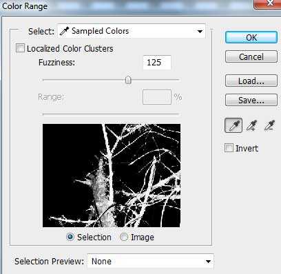 Здесь вы можете добавлять и удалять цвета, которые вы хотите выделить. Опция смутности (Fuzziness) похожа на значение допуска (Tolerance) Волшебной палочки. Чем она выше, тем больше количество выделенных цветов и наоборот. При открытом диалоговом окне вы заметите, что когда вы будете водить мышкой над вашим изображением, будет выбрана «пипетка». Я кликнул на небо, затем установил значение смутности – 82. Все небо после этого должно быть белого цвета, а дерево – черного. Белый цвет означает ту область, которая будет выделена.