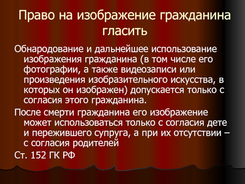 К примеру, статья 145 «Право на собственное изображение» Гражданского кодекса. В ней говорится, что никто не имеет права использовать изображение какого-либо лица без его согласия, а в случае его смерти — без согласия наследников. Опубликование, воспроизведение и распространение изобразительного произведения (картина, фотография, кинофильм и другие), в котором изображено другое лицо, допускается лишь с согласия изображенного, а после его смерти с согласия его детей и пережившего супруга. Такого согласия не требуется, если это установлено законодательными актами, либо изображенное лицо позировало за плату.