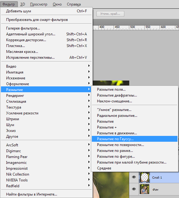 Также вам нужно будет затемненный фон размыть. В этом вам поможет меню: «Фильтр – Размытие — Размытие по Гауссу» .