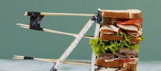 Им нужна опора. Позади этих аппетитных бутербродов скрывается произведение инженерного искусства, которое поддерживает структуру. Вся конструкция зафиксирована клейкой лентой, зубочистками и картоном.