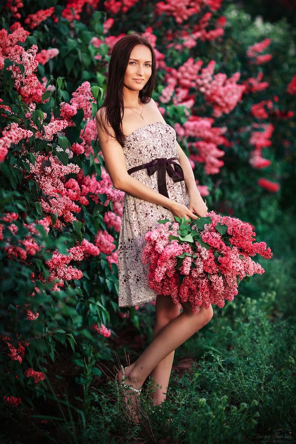 Хороший кадр – сидя на траве или в лесных цветах, стоя возле цветущего дерева.