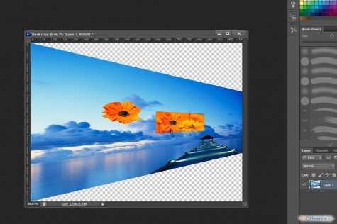 После этого копируем соответствующий графический элемент с помощью сочетания клавиш Ctrl и C и вставляем в изображение, открытое в соседнем проекте, нажав Ctrl и V. В результате произойдет наложение картинки с цветами на ту, где сфотографирован морской пирс.