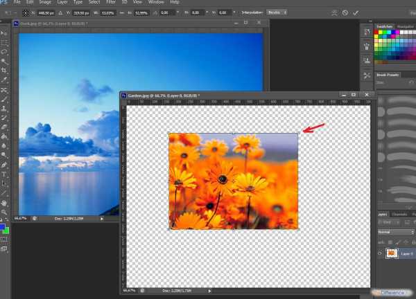 Теперь можно осуществлять наложение слоев. Попробуем разместить тот, на котором изображены цветы, на том, где открыта фотография морского пирса.