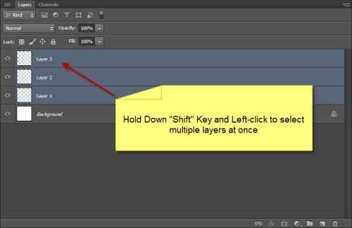 Ну что ж, этот метод не сработал, поэтому я грустно нажимаю Ctrl+Z (Win) или Command+Z (Mac), чтобы отменить последнее действие. Еще один способ объединить слои заключается в команде «Объединить слои» (Merge Layers). Выделив самый верхний слой, я нажимаю клавишу Shift и кликаю по среднему слою. Это позволяет одновременно выделить оба слоя: