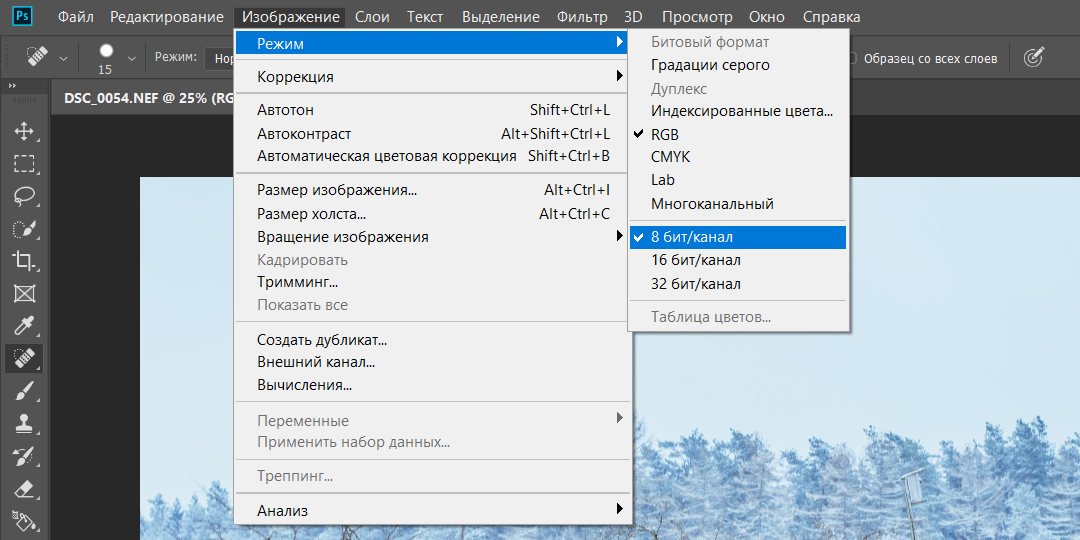 При этом выпадет меню, показывающее все цветовые режимы, которые может использовать Photoshop. У текущего режима слева будет стоять галка: