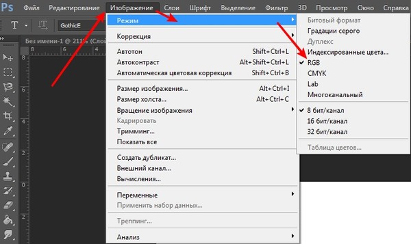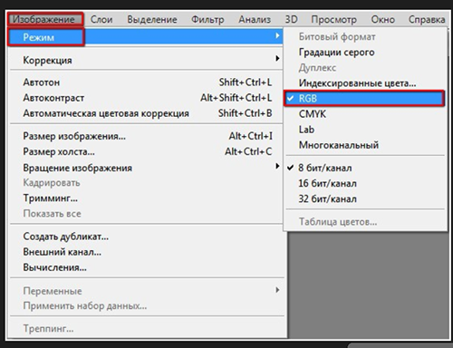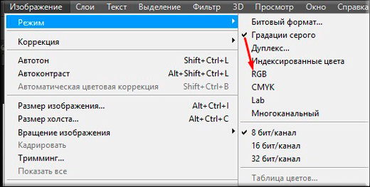 Переключить режим можно из верхнего меню. Идем по пути Изображение -> Режим. Здесь выбираем нужный. Обычно используется RGB режим.