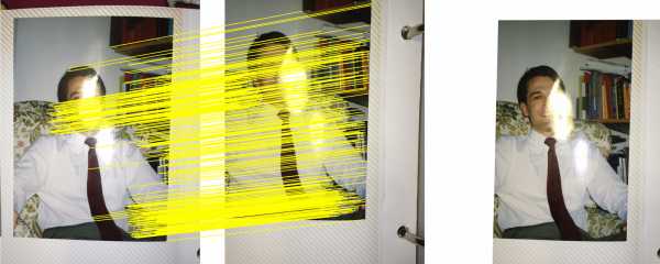 Мы начинаем с набора снимков фотографии, сделанных пользователем, передвигавшим камеру. Первый снимок – «опорный кадр» – определяет желаемый конечный вид снимка. Затем пользователю рекомендуют сделать четыре дополнительных снимка. В каждом кадре мы определяем ключевые точки (подсчитываем свойства ORB на углах, определённых при помощи алгоритма Харриса) и используем их для определения гомографий, сопоставляющих каждый последующий кадр с опорным.Скрытый текст