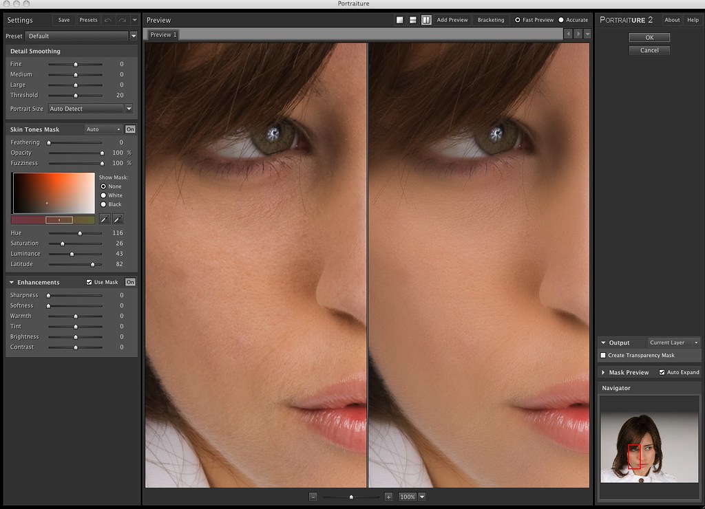 Окно предпросмотра показывает все изменения на копии снимка. Portraiture изменяет видимую часть изображения в режиме реального времени, как только вы начинаете двигать ползунки настроек. Если вы нажмете левую кнопку мыши на измененном изображении, то оно сменится на оригинал. Так можно быстро посмотреть разницу. Зуммировать изображение от 10% до 800% можно ползунком внизу, или просто кнопками ctrl +/- на клавиатуре. В зависимости от зума и размеров исходного снимка, накладывание настроек на превью может подтормаживать. Для ускорения можно использовать функцию «Fast Preview», расположенную вверху справа, над окном предпросмотра. «Accurate» соответственно даст более точный, но и медленный результат.