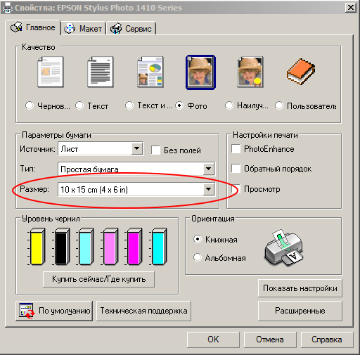 - выберите размер бумаги (10х15 или A6) и ее тип;