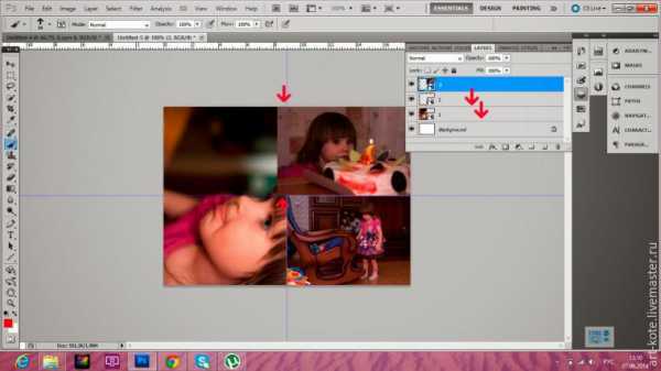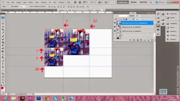 А вот пример, как уместить «квадартики» разного размера. Создаем сначала направляющие: горизонтальную 5 см и вертикальную 5 см, помещаем туда наше фото. Затем добавляем вертикальную 12 (5+7 см) и горизонтальную 7 см, таким образом рядышком поместилось фото 7х7 см. Можем добавить еще горизонтальную 10 см, и внизу поместится еще один квадратик 5х5 см: