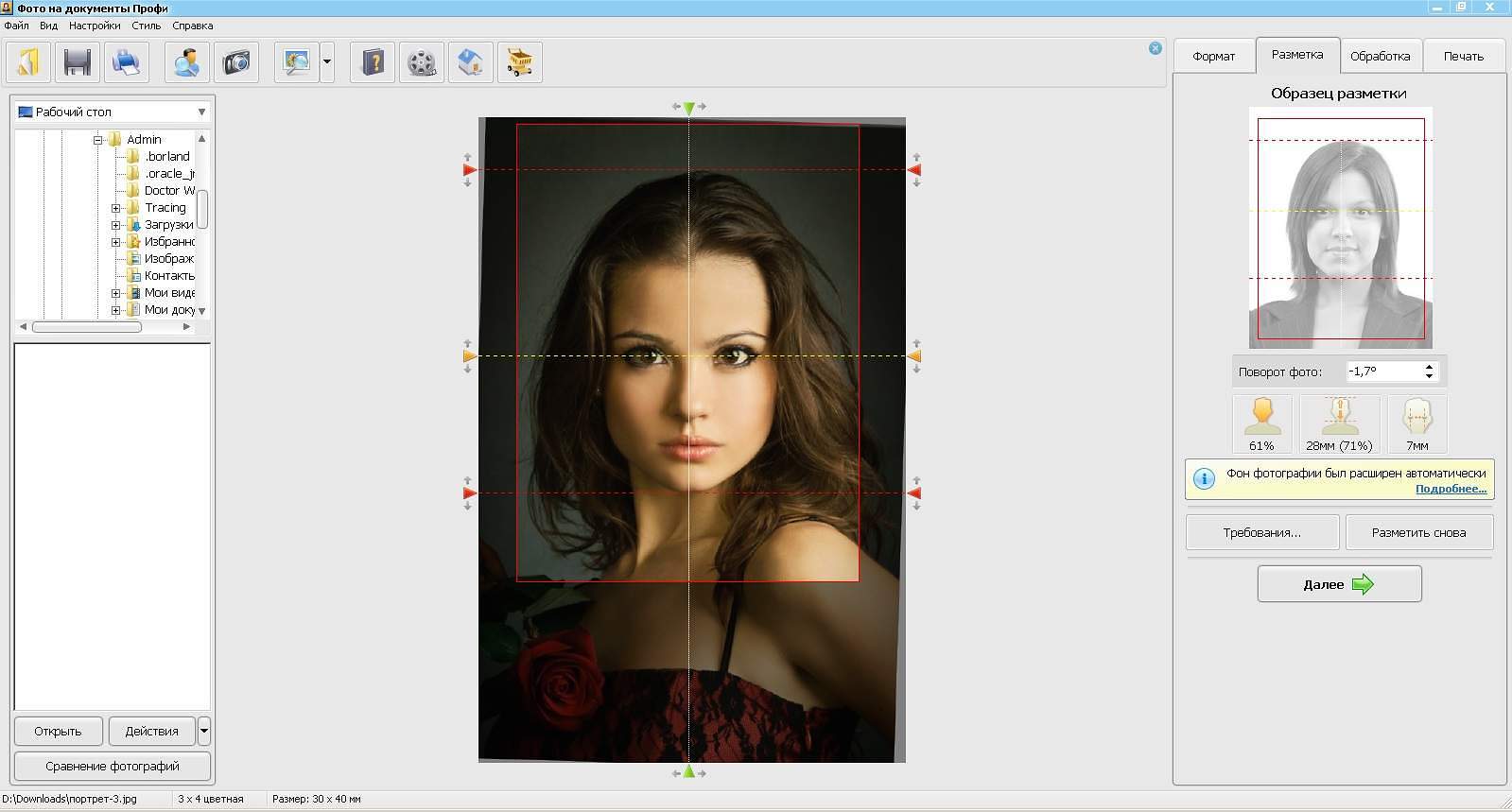 - Верхнюю горизонтальную линию устанавливаем на макушке, среднюю — на уровне глаз, нижнюю — на подбородке (нижняя точка лица). Проверяем положение вертикальной линии, чтобы она располагалась строго между глаз. Жмем «Далее».