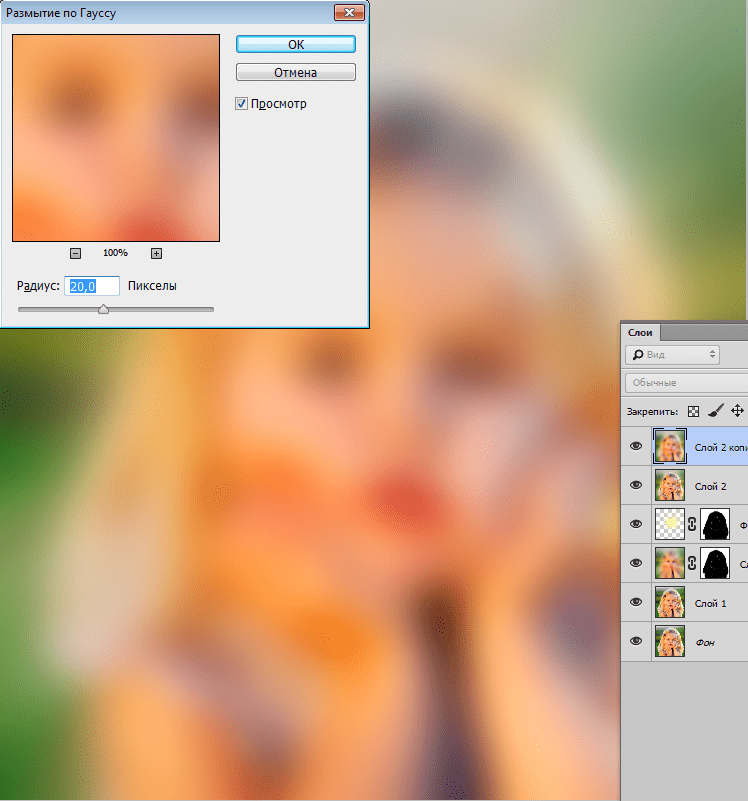 Далее для дубликата слоя нажимаем Фильтр — Размытие — Размытие по Гауссу. Можно также использовать другие варианты размытия, предложенные в меню.