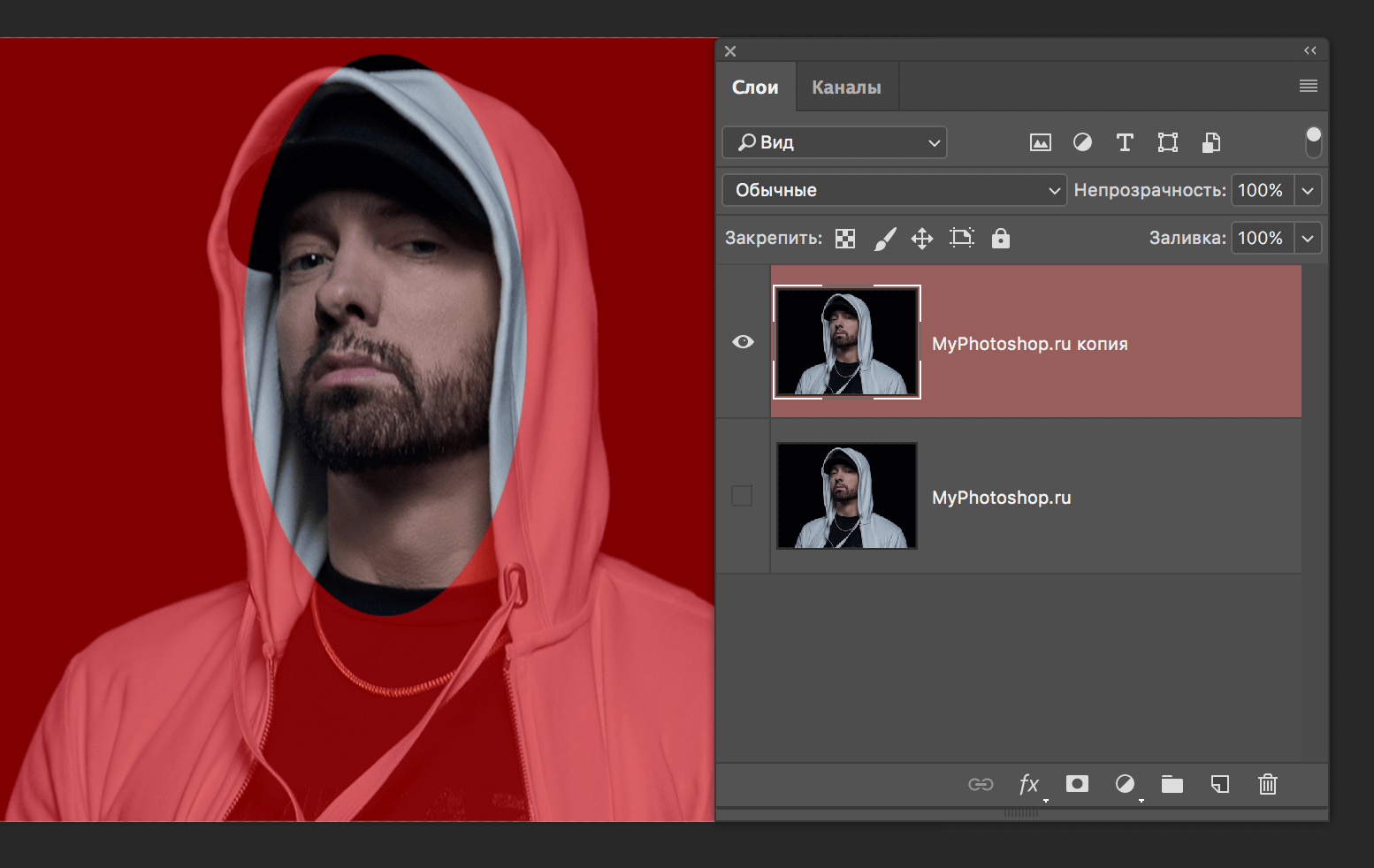 - Если после наложения слоя маски, нажать комбинацию кнопок Ctrl+i, то произойдёт инверсия.