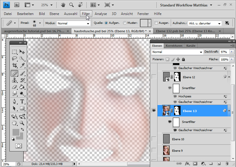 - Переключился на слой частоты? Давайте начнем работать над этим. Перейдите в меню фильтров и затем Фильтр — Размытие — Размытие по Гауссу . Исправьте пиксель радиуса до того места, где вы нашли правильный баланс, чтобы скрыть дефекты кожи. Вы можете увеличивать и уменьшать масштаб и находить самые заметные участки кожи для работы. Нажмите «ОК».