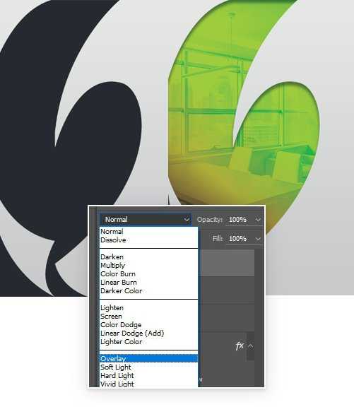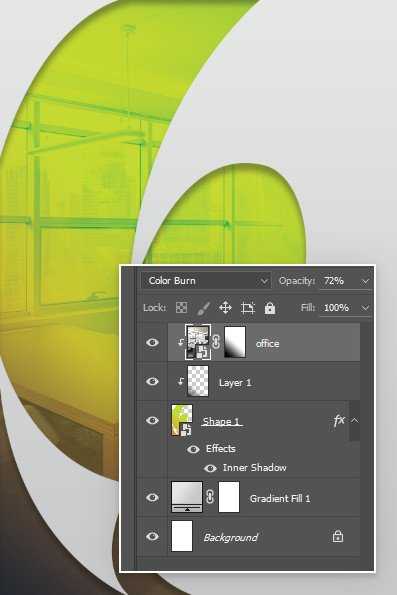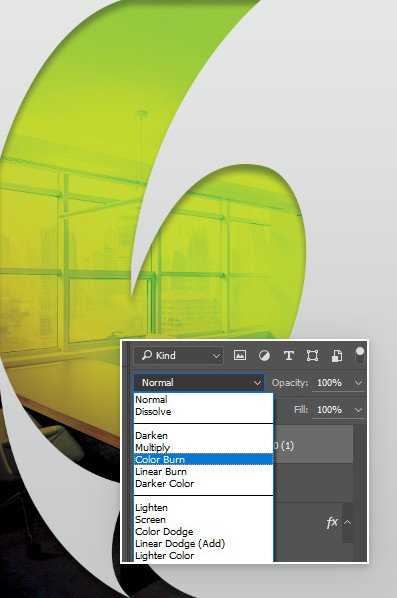 Меняем режим смешивания слоя на Color Burn (Затемнение основы). Жмем Ctrl+Alt+G, чтобы фото с офисом также преобразовать в обтравочную маску.