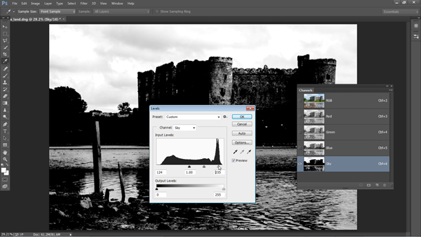 Чтобы получить качественное выделение, нам необходимо иметь очень четкое разделение между небом и землей. Начнем с увеличения контраста. Идем в Image>Adjustments>Levels (Изображение>Коррекция>Уровни) в появившемся окне перетаскиваем черный слайдер до значения 124, а белый до 235. Нажимаем Ok.