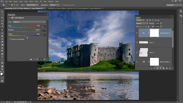 Удерживая клавишу Alt, выберите образец, которым затем можно будет закрасить неточности, допущенные инструментом Заплатка. И наконец, последний штрих – добавьте новый корректирующий слой Colour Balance (Цветовой Баланс) и установите следующие значения: Cyan/Red -20 and Yellow/Blue +5.