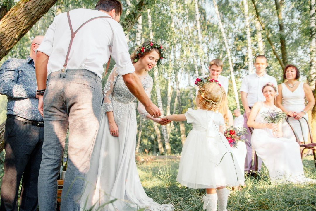 Невеста в платье Murashka, идущая к алтарю с сыном на руках