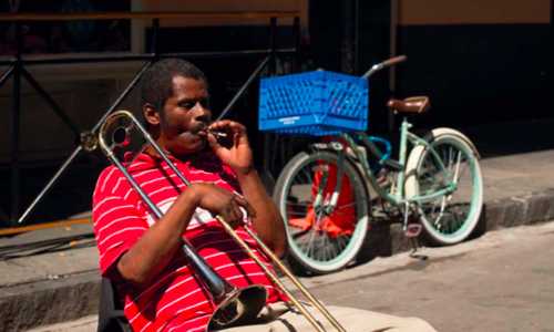 «Во время мастер-класса в Новом Орлеане мы с учениками встретили тромбониста, сидевшего неподалеку от припаркованного велосипеда с голубой пластиковой корзиной. Я подсказал своим подопечным найти ракурс, который — при фокусном расстоянии объектива 200— 300 мм — позволил бы поместить в кадр расфокусированную корзину на контрасте с красной футболкой музыканта в зоне резкости.»
