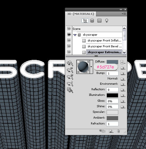 В «Сцене» (Scene) панели «3D» установите «Глобальный цвет естественного освещения» (Global Ambient Color) #575757. Цвет внешней среды определяет яркость сцены, когда выключены все искусственные источники освещения: